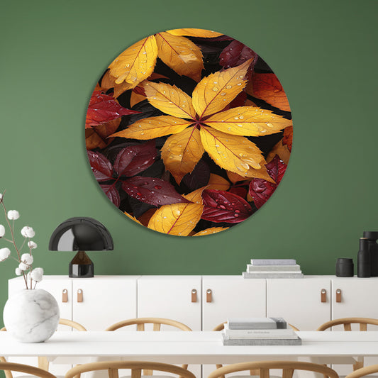 Kleurrijk herfstbladeren met waterdruppels aluminium muurcirkel