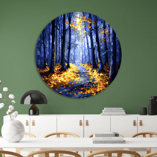 Kleurrijk herfstbos met zonlicht aluminium muurcirkel