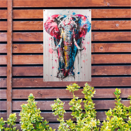 Kleurrijk olifantschilderij met dynamische verfspatten tuinposter