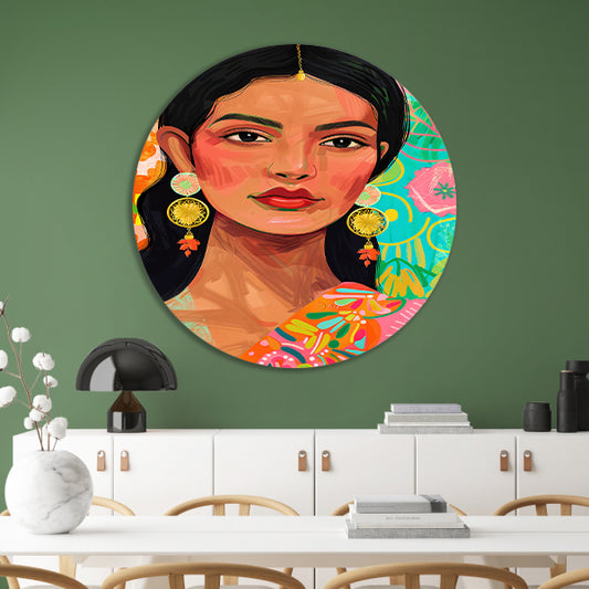 Kleurrijk portret Indiase vrouw met bloemenachtergrond aluminium muurcirkel