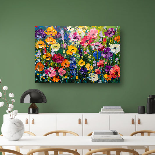 Kleurrijk schilderij van bloemenweide canvas met baklijst
