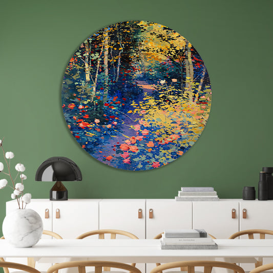 Kleurrijk schilderij van een bloemenrijk bos aluminium muurcirkel