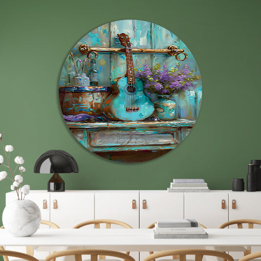 Kleurrijk schilderij van gitaar en bloemen aluminium muurcirkel