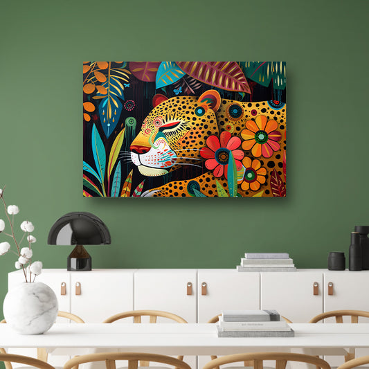 Kleurrijk schilderij van luipaard en bloemen canvas