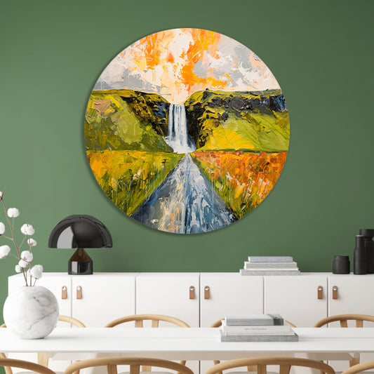 Kleurrijk schilderij van landschap met waterval aluminium muurcirkel