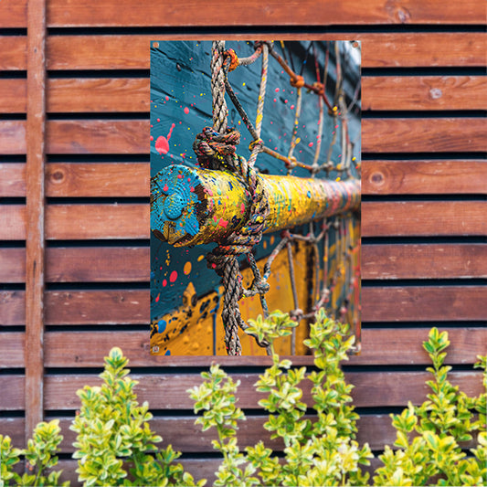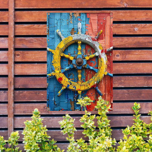 Kleurrijk Stuurwiel op Verweerde Houten Muur tuinposter
