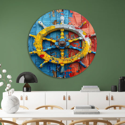 Kleurrijk Stuurwiel op Verweerde Houten Muur aluminium muurcirkel