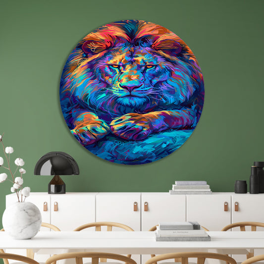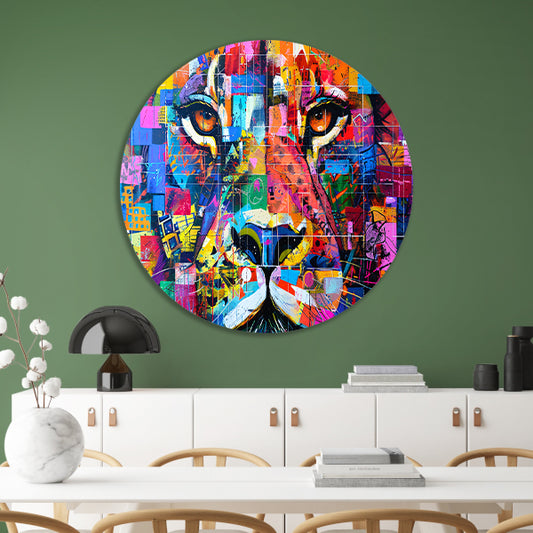 Kleurrijke abstracte leeuw voor moderne interieurs aluminium muurcirkel