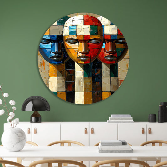 Kleurrijke abstracte maskers met blokken aluminium muurcirkel