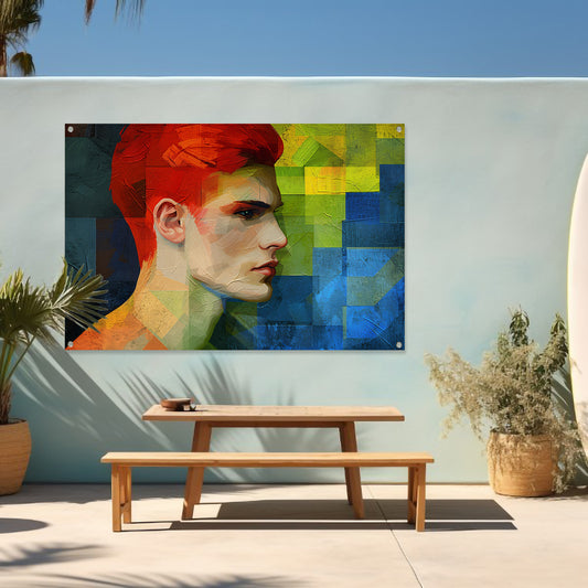 Abstract portret van man in levendige kleuren canvas met baklijst