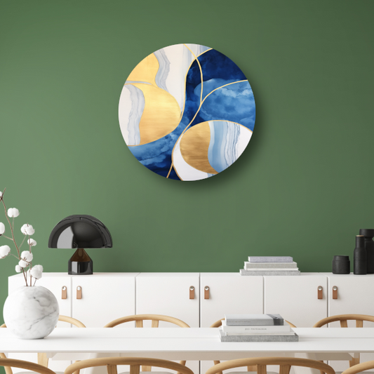 Abstract schilderij in blauw, wit en goud aluminium muurcirkel