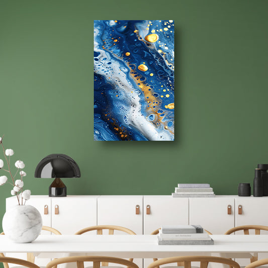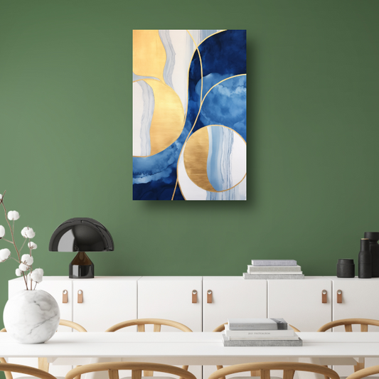Abstract schilderij in blauw, wit en goud canvas met baklijst