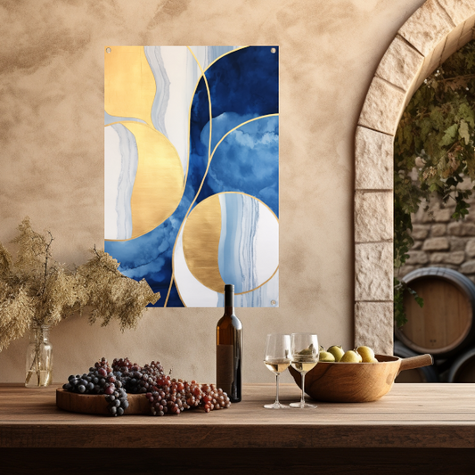 Abstract schilderij met blauwe en gouden tinten tuinposter