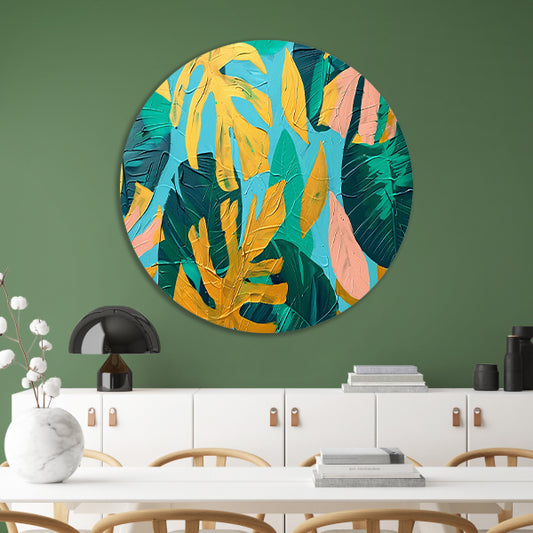 Abstract schilderij met kleurrijke tropische bladeren forex muurcirkel