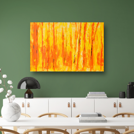 Abstract schilderij met paarse en gele kleuren canvas met baklijst