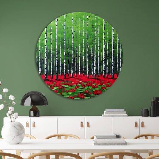 Abstract schilderij van bos met bloemen aluminium muurcirkel