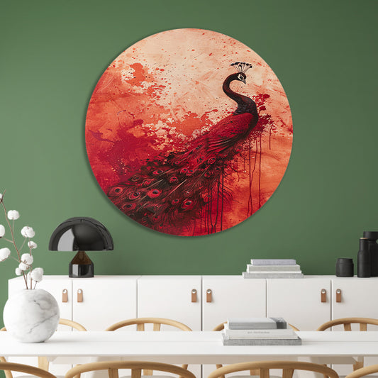 Abstract schilderij van een pauw met verfspatten aluminium muurcirkel
