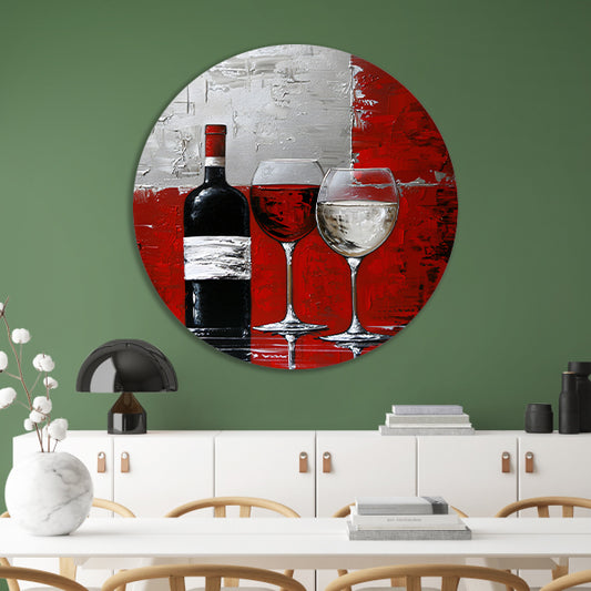 Abstract schilderij van wijnfles en glazen aluminium muurcirkel