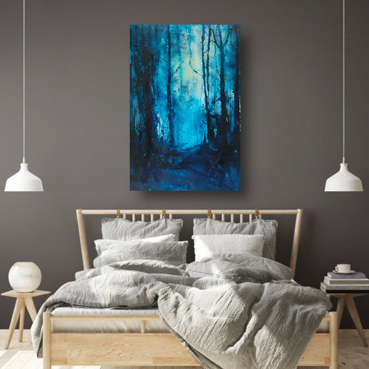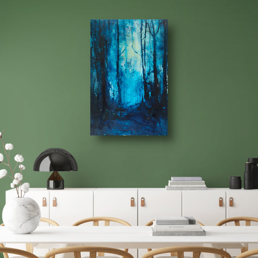 Abstract blauw bos in dynamische penseelstreken canvas met baklijst