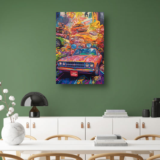 Abstracte auto in kleurrijk landschap aluminium muurcirkel