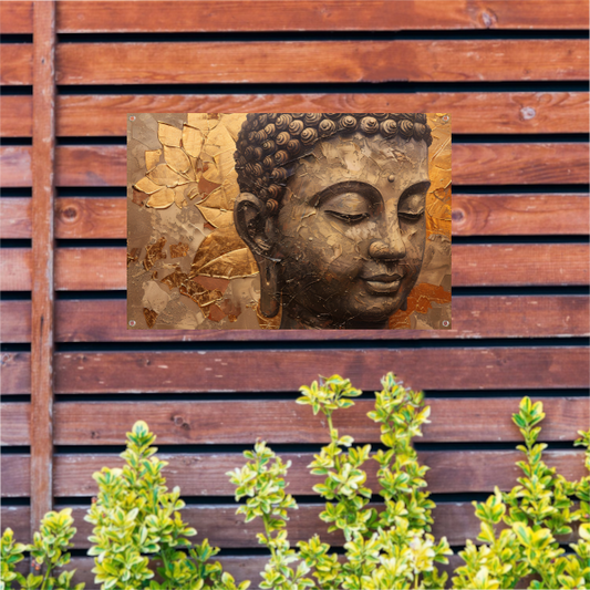Abstracte Boeddha met serene blik en gouden bladeren tuinposter