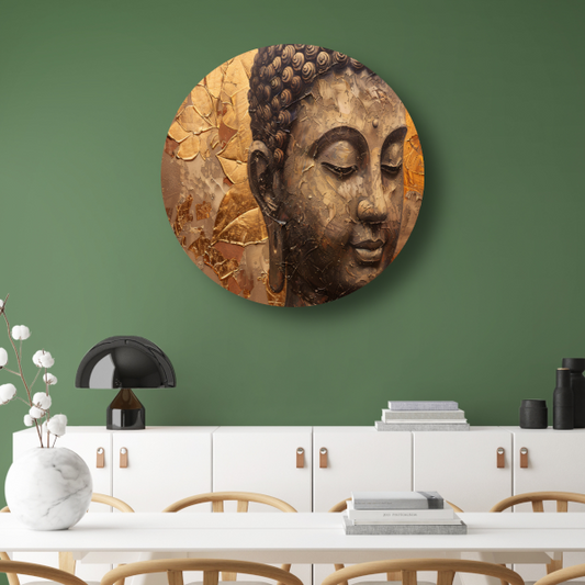 Abstracte Boeddha met serene blik en gouden bladeren aluminium muurcirkel