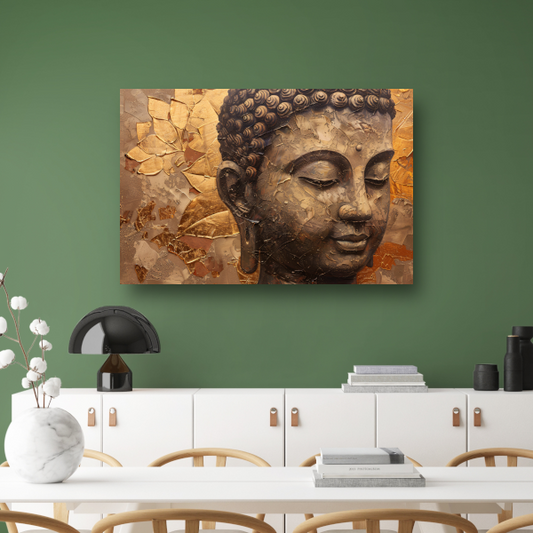 Abstracte Boeddha met serene blik en gouden bladeren canvas