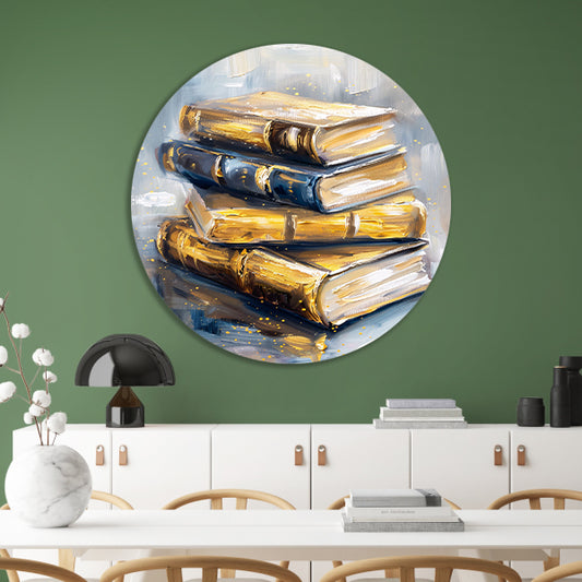 Abstracte boekenstapel in goud en blauw aluminium muurcirkel