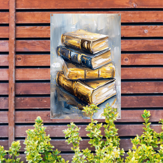 Abstracte boekenstapel in goud en blauw tuinposter