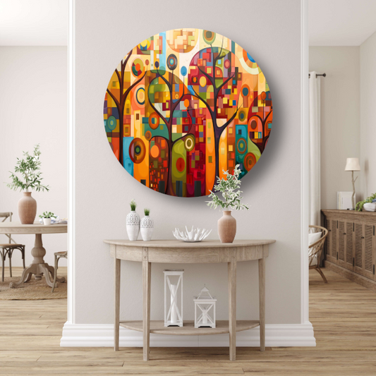 Abstracte bomen in stedelijke kleurenpracht aluminium muurcirkel
