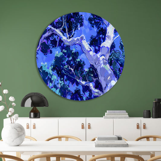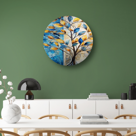 Abstracte Boom in Levendige Blauw en Geeltinten aluminium muurcirkel