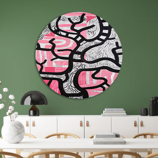 Abstracte boom met roze en zwarte accenten aluminium muurcirkel