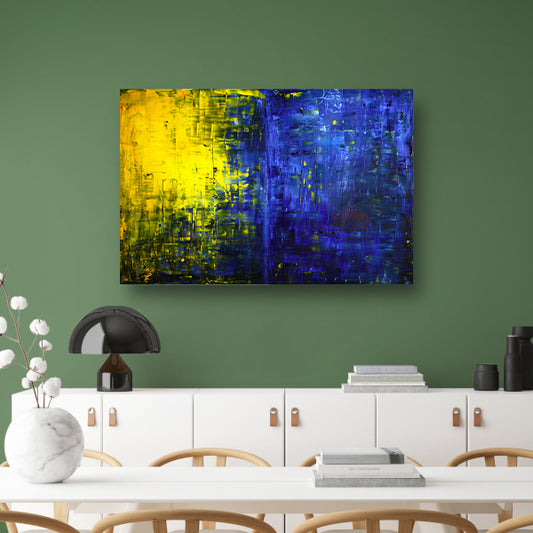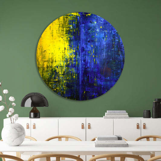 Abstracte compositie in blauw en geel aluminium muurcirkel