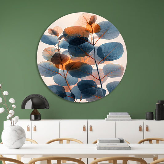 Abstracte compositie van blauwe en oranje bladeren aluminium muurcirkel