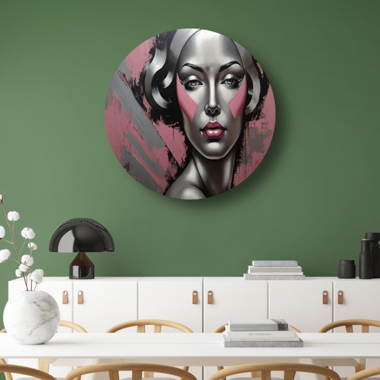 Abstracte Dame in Zilver en Roze Tinten aluminium muurcirkel