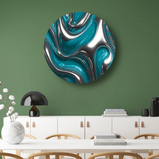Abstracte dans van zilver en turquoise aluminium muurcirkel