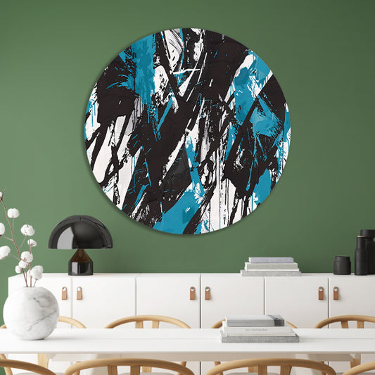 Abstracte dynamiek in zwart, wit en blauw aluminium muurcirkel