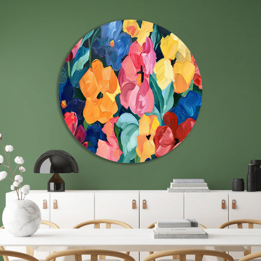 Abstracte explosie van kleurrijke bloemen en bladeren aluminium muurcirkel