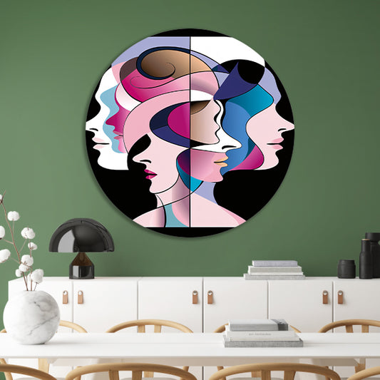 Abstracte gelaagde gezichten in felle kleuren aluminium muurcirkel