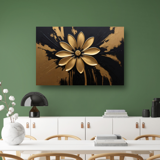 Abstracte Gouden Bloem op Zwart canvas met baklijst