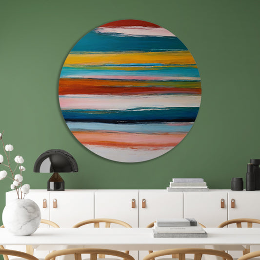 Abstracte horizon in rood, geel en blauw aluminium muurcirkel