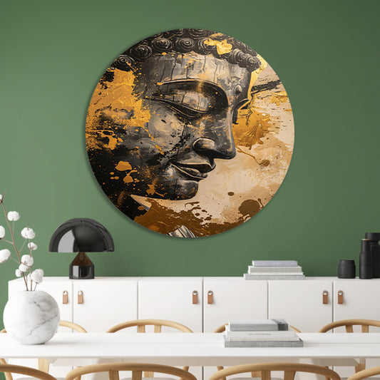 Abstracte interpretatie van Boeddha met gouden tinten aluminium muurcirkel