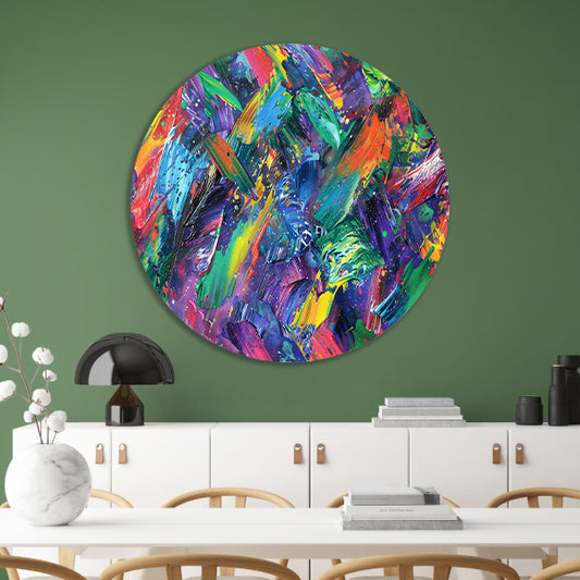 Abstracte kleurenexplosie met dynamische penseelstreken aluminium muurcirkel