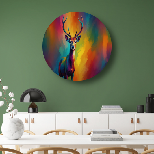 Abstracte kleurenpracht met statig hert aluminium muurcirkel