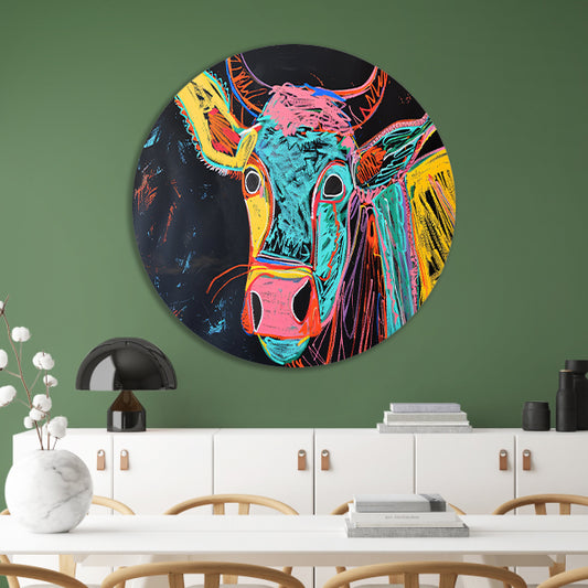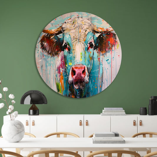Abstracte kleurrijke koe schilderij aluminium muurcirkel