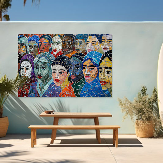 Abstracte kleurrijke mozaïek van diverse gezichten tuinposter