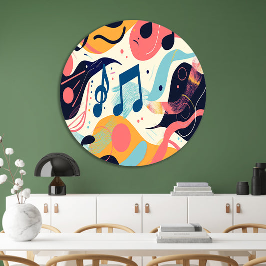 Abstracte kleurrijke muzieknotities in beweging aluminium muurcirkel