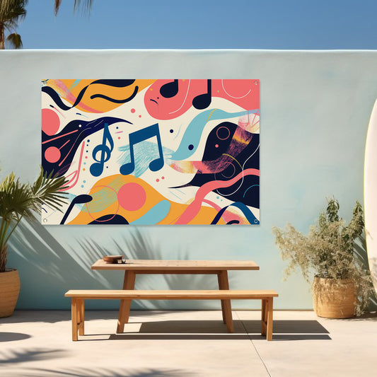 Abstracte kleurrijke muzieknotities in beweging tuinposter