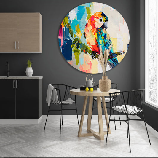 Abstracte kleurrijke papegaai op tak aluminium muurcirkel
