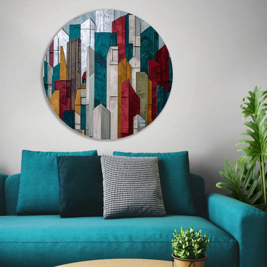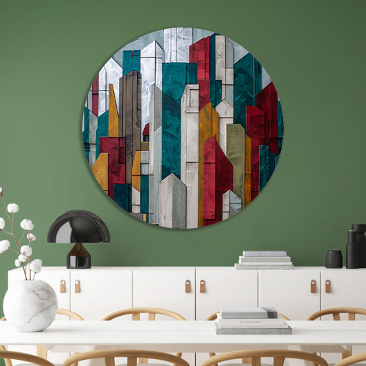 Abstracte kleurrijke skyline met geometrische vormen aluminium muurcirkel